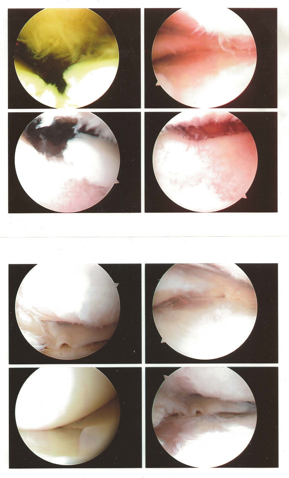 That's the pictures of my knee before and after the ortho surgeon cleaned it up. The feathering is typical of osteoarthritis. In addition, I got a high tibial osteotomy, which I affectionately refer to as a bone wedgie.
